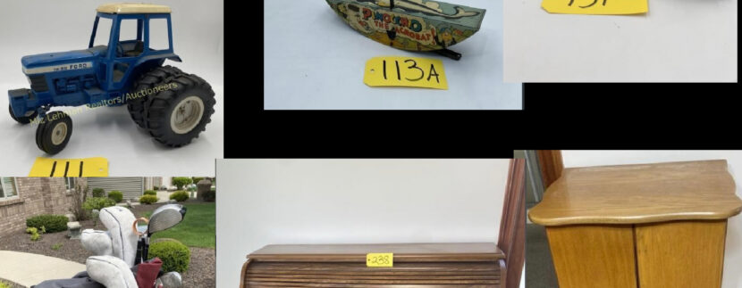 Electric rocker recliner; John Deere 524 Roto Tiller; Ertl Toys–Ford, John Deere, IH (Tractors, Combines, Hopper Wagons, Grain Conveyor, Disk Plow, and more); Lots of John Deere Items; Lithograph Pinocchio and Lone Ranger; Tonka Trucks; Corning Ware; Stainless Steel Mixing…